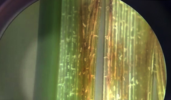 近些年水(shuǐ)稻產區受到斯氏狹跗線蟎等種類的為害有上升趨勢(shì),對糧食生產造成(chéng)嚴重損失。水稻跗(fū)線蟎蟲體(tǐ)微(wēi)小,體長僅0.1~0.3毫米,一般肉眼見不到,乳白色,主要存在水稻葉鞘內,剝開(kāi)葉鞘,肉(ròu)眼可見葉鞘內壁表麵似有(yǒu)白色粉塵,用放大鏡(jìng)或雙目解剖鏡觀察,可看到很(hěn)多細小的蟎蟲蠕動和爬行。
